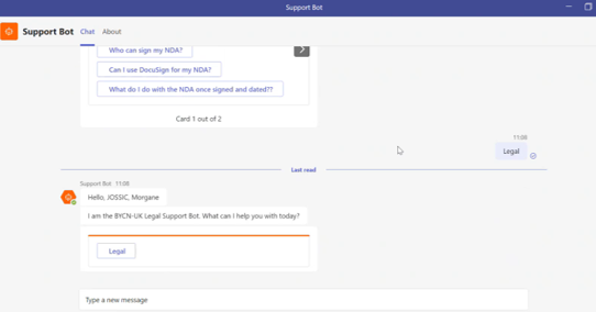 - Information on procedures: the Legal SupportBot can help you with queries on who can sign your legal documents, what to do if you receive a claim, queries on insurance, NDAs and other, with more features being added in due course.